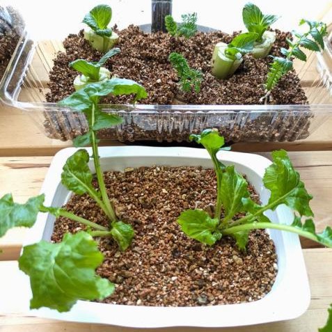 よく知られている豆苗はもちろん、小松菜やネギの根元や、大根、ニンジン、カブなどのヘタを切り取っておき、水や土(室内ならバーミキュライトなどもおすすめ)に刺しておくと、やがて新しい葉が伸びてきます。フードロスや節約につながるだけでなく、青々とした葉が日々少しずつ伸びてゆくのは見ていてとても楽しいものです。ある程度の量になって収穫までできると、ちょっとした達成感もあります。ほかにも、水や光をあげないと元気に育たないこと、野菜ごとに葉の形や色がまったく違うことなど、学べることは実にたくさんあります。