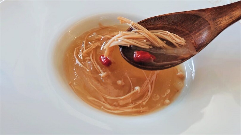 昆布と鰹節のお出汁をベースに、エノキの旨味と食感、そして柔らかい冬瓜で美味しいスープの出来上がり♪(冬瓜が手に入らない方は大根でどうぞ)